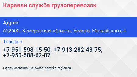 Караван, служба грузоперевозок по адресу 652600, Кемеровская область, Белово, Можайского, 4 в дальнейшем Организация, размещена в следующих категориях: