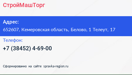 СтройМашТорг по адресу 652607, Кемеровская область, Белово, 1 Телеут, 17 в дальнейшем Организация, размещена в следующих категориях: