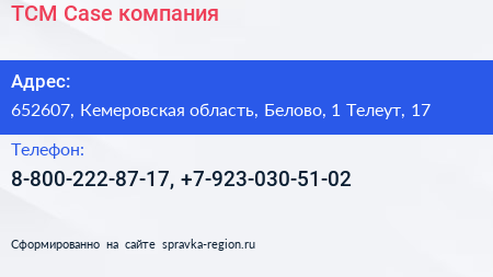 ТСМ Case, компания по адресу 652607, Кемеровская область, Белово, 1 Телеут, 17 в дальнейшем Организация, размещена в следующих категориях: