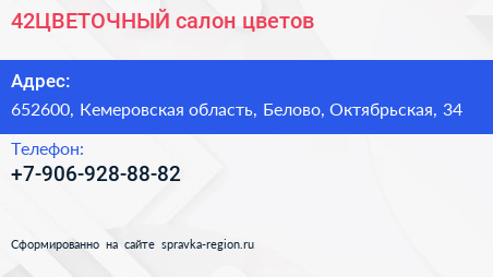 42ЦВЕТОЧНЫЙ, салон цветов по адресу 652600, Кемеровская область, Белово, Октябрьская, 34 в дальнейшем Организация, размещена в следующих категориях: