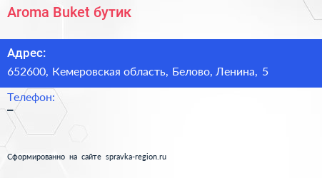 Aroma Buket, бутик по адресу 652600, Кемеровская область, Белово, Ленина, 5 в дальнейшем Организация, размещена в следующих категориях: