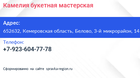 Камелия, букетная мастерская по адресу 652632, Кемеровская область, Белово, 3-й микрорайон, 14 в дальнейшем Организация, размещена в следующих категориях: