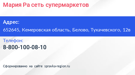 Мария-Ра, сеть супермаркетов по адресу 652645, Кемеровская область, Белово, Тухачевского, 12в в дальнейшем Организация, размещена в следующих категориях: