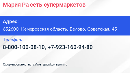 Мария-Ра, сеть супермаркетов по адресу 652600, Кемеровская область, Белово, Советская, 45 в дальнейшем Организация, размещена в следующих категориях:
