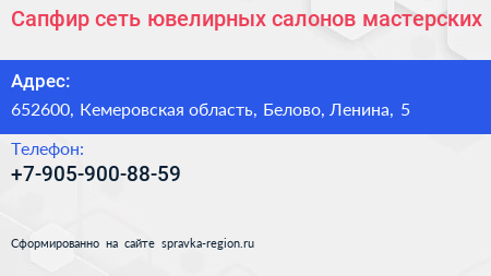 Сапфир, сеть ювелирных салонов-мастерских по адресу 652600, Кемеровская область, Белово, Ленина, 5 в дальнейшем Организация, размещена в следующих категориях: