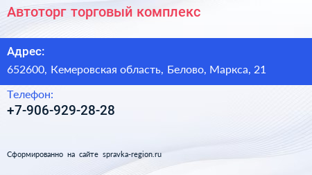 Автоторг, торговый комплекс по адресу 652600, Кемеровская область, Белово, Маркса, 21 в дальнейшем Организация, размещена в следующих категориях: