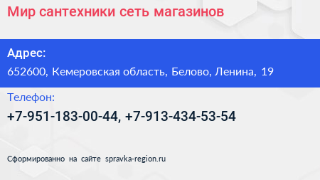 Мир сантехники, сеть магазинов по адресу 652600, Кемеровская область, Белово, Ленина, 19 в дальнейшем Организация, размещена в следующих категориях: