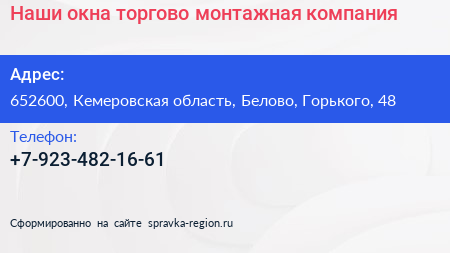 Наши окна, торгово-монтажная компания по адресу 652600, Кемеровская область, Белово, Горького, 48 в дальнейшем Организация, размещена в следующих категориях: