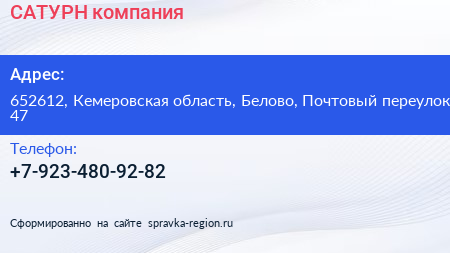САТУРН, компания по адресу 652612, Кемеровская область, Белово, Почтовый переулок, 47 в дальнейшем Организация, размещена в следующих категориях: