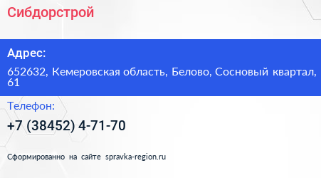 Сибдорстрой по адресу 652632, Кемеровская область, Белово, Сосновый квартал, 61 в дальнейшем Организация, размещена в следующих категориях: