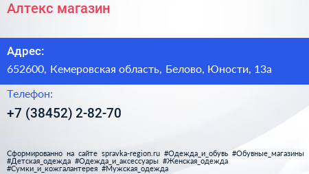 Алтекс, магазин по адресу 652600, Кемеровская область, Белово, Юности, 13а в дальнейшем Организация, размещена в следующих категориях: