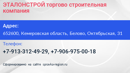 ЭТАЛОНСТРОЙ, торгово-строительная компания по адресу 652600, Кемеровская область, Белово, Октябрьская, 31 в дальнейшем Организация, размещена в следующих категориях: