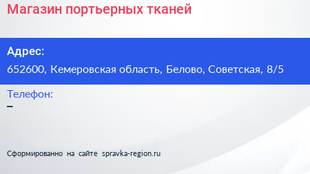 Магазин портьерных тканей по адресу 652600, Кемеровская область, Белово, Советская, 8/5 в дальнейшем Организация, размещена в следующих категориях: