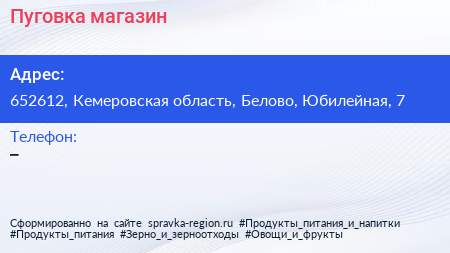 Пуговка, магазин по адресу 652612, Кемеровская область, Белово, Юбилейная, 7 в дальнейшем Организация, размещена в следующих категориях: