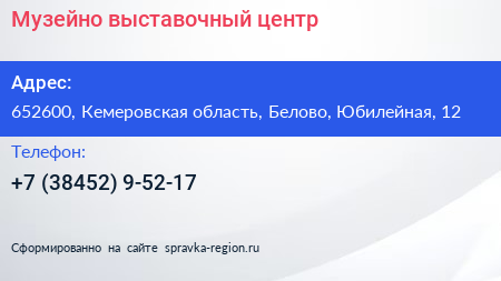 Музейно-выставочный центр по адресу 652600, Кемеровская область, Белово, Юбилейная, 12 в дальнейшем Организация, размещена в следующих категориях: