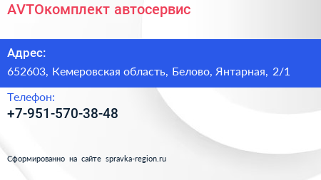 AVTOкомплект, автосервис по адресу 652603, Кемеровская область, Белово, Янтарная, 2/1 в дальнейшем Организация, размещена в следующих категориях: