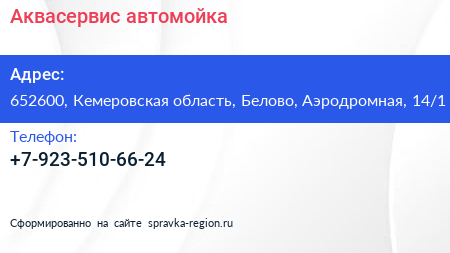 Аквасервис, автомойка по адресу 652600, Кемеровская область, Белово, Аэродромная, 14/1 в дальнейшем Организация, размещена в следующих категориях:
