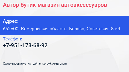 Автор бутик, магазин автоаксессуаров по адресу 652600, Кемеровская область, Белово, Советская, 8 к4 в дальнейшем Организация, размещена в следующих категориях: