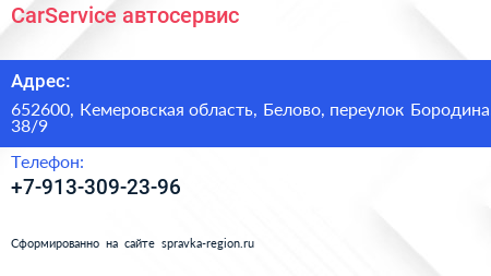 CarService, автосервис по адресу 652600, Кемеровская область, Белово, переулок Бородина, 38/9 в дальнейшем Организация, размещена в следующих категориях: