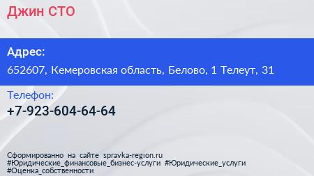 Джин, СТО по адресу 652607, Кемеровская область, Белово, 1 Телеут, 31 в дальнейшем Организация, размещена в следующих категориях: