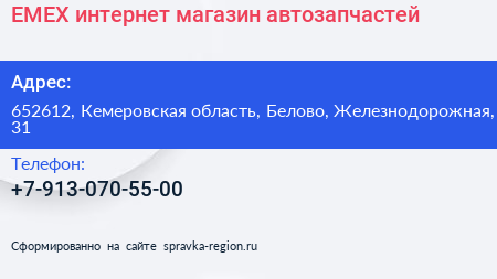 EMEX, интернет-магазин автозапчастей по адресу 652612, Кемеровская область, Белово, Железнодорожная, 31 в дальнейшем Организация, размещена в следующих категориях: