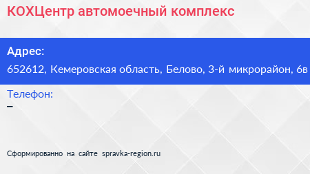 КОХЦентр, автомоечный комплекс по адресу 652612, Кемеровская область, Белово, 3-й микрорайон, 6в в дальнейшем Организация, размещена в следующих категориях: