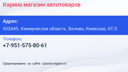 Карина, магазин автотоваров по адресу 652645, Кемеровская область, Белово, Киевская, 47/2 в дальнейшем Организация, размещена в следующих категориях: