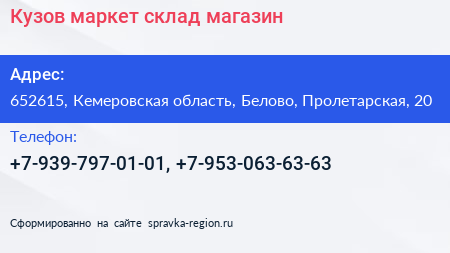 Кузов-маркет, склад-магазин по адресу 652615, Кемеровская область, Белово, Пролетарская, 20 в дальнейшем Организация, размещена в следующих категориях: