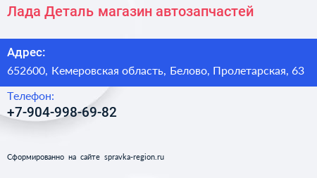 Лада Деталь, магазин автозапчастей по адресу 652600, Кемеровская область, Белово, Пролетарская, 63 в дальнейшем Организация, размещена в следующих категориях: