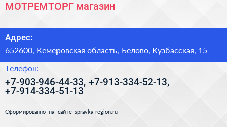 МОТРЕМТОРГ, магазин по адресу 652600, Кемеровская область, Белово, Кузбасская, 15 в дальнейшем Организация, размещена в следующих категориях: