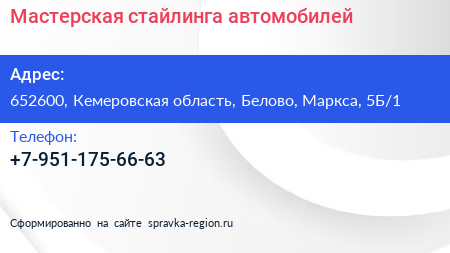 Мастерская стайлинга автомобилей по адресу 652600, Кемеровская область, Белово, Маркса, 5Б/1 в дальнейшем Организация, размещена в следующих категориях: