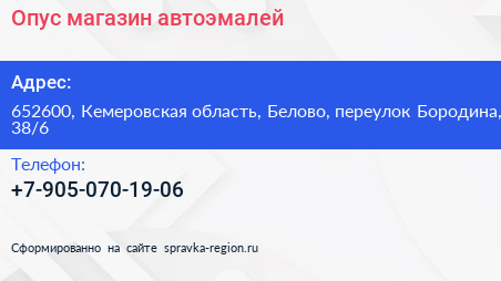 Опус, магазин автоэмалей по адресу 652600, Кемеровская область, Белово, переулок Бородина, 38/6 в дальнейшем Организация, размещена в следующих категориях: