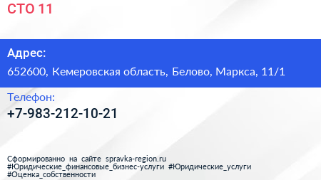 СТО 11 по адресу 652600, Кемеровская область, Белово, Маркса, 11/1 в дальнейшем Организация, размещена в следующих категориях: