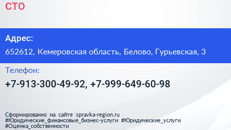 СТО по адресу 652612, Кемеровская область, Белово, Гурьевская, 3 в дальнейшем Организация, размещена в следующих категориях: