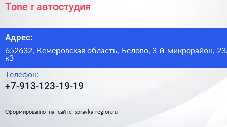 Tone`r, автостудия по адресу 652632, Кемеровская область, Белово, 3-й микрорайон, 23а к3 в дальнейшем Организация, размещена в следующих категориях: