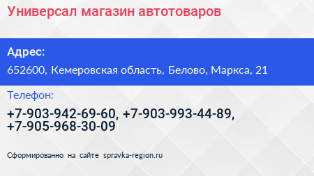 Универсал, магазин автотоваров по адресу 652600, Кемеровская область, Белово, Маркса, 21 в дальнейшем Организация, размещена в следующих категориях: