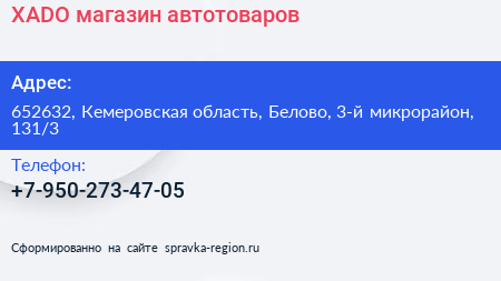 XADO, магазин автотоваров по адресу 652632, Кемеровская область, Белово, 3-й микрорайон, 131/3 в дальнейшем Организация, размещена в следующих категориях:
