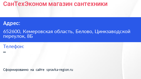 СанТехЭконом, магазин сантехники по адресу 652600, Кемеровская область, Белово, Цинкзаводской переулок, 8Б в дальнейшем Организация, размещена в следующих категориях: