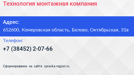 Технология, монтажная компания по адресу 652600, Кемеровская область, Белово, Октябрьская, 31в в дальнейшем Организация, размещена в следующих категориях: