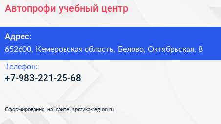 Автопрофи, учебный центр по адресу 652600, Кемеровская область, Белово, Октябрьская, 8 в дальнейшем Организация, размещена в следующих категориях: