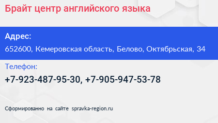 Брайт, центр английского языка по адресу 652600, Кемеровская область, Белово, Октябрьская, 34 в дальнейшем Организация, размещена в следующих категориях: