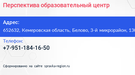 Перспектива, образовательный центр по адресу 652632, Кемеровская область, Белово, 3-й микрорайон, 130 в дальнейшем Организация, размещена в следующих категориях: