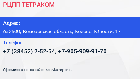 РЦПП ТЕТРАКОМ по адресу 652600, Кемеровская область, Белово, Юности, 17 в дальнейшем Организация, размещена в следующих категориях: