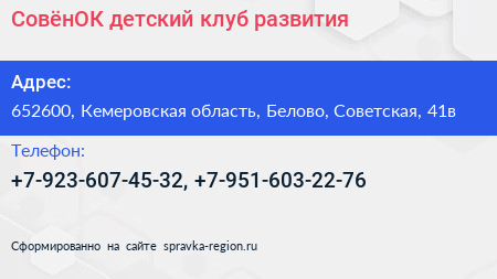 СовёнОК, детский клуб развития по адресу 652600, Кемеровская область, Белово, Советская, 41в в дальнейшем Организация, размещена в следующих категориях:
