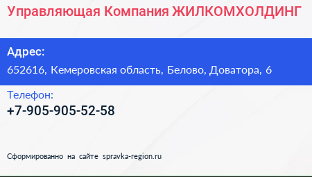 Управляющая Компания ЖИЛКОМХОЛДИНГ по адресу 652616, Кемеровская область, Белово, Доватора, 6 в дальнейшем Организация, размещена в следующих категориях: