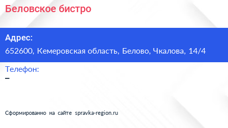 Беловское бистро по адресу 652600, Кемеровская область, Белово, Чкалова, 14/4 в дальнейшем Организация, размещена в следующих категориях: