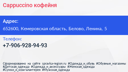 Cappuccino, кофейня по адресу 652600, Кемеровская область, Белово, Ленина, 5 в дальнейшем Организация, размещена в следующих категориях: