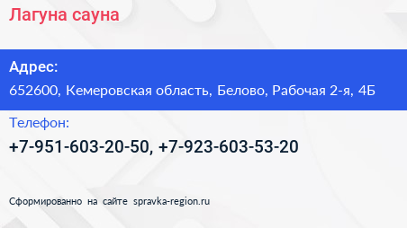 Лагуна, сауна по адресу 652600, Кемеровская область, Белово, Рабочая 2-я, 4Б в дальнейшем Организация, размещена в следующих категориях:
