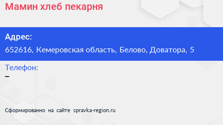 Мамин хлеб, пекарня по адресу 652616, Кемеровская область, Белово, Доватора, 5 в дальнейшем Организация, размещена в следующих категориях: