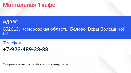 Мангальная 1, кафе по адресу 652615, Кемеровская область, Белово, Веры Волошиной, 82 в дальнейшем Организация, размещена в следующих категориях: